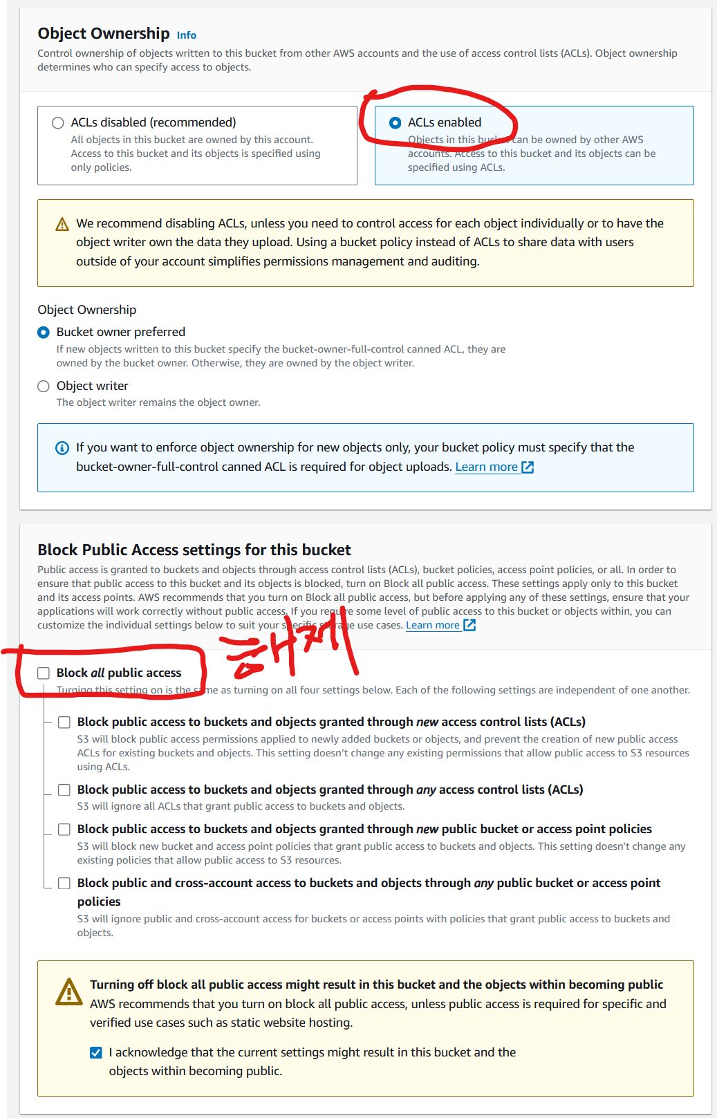 public한 버킷을 위해 아래와 같이 ACL 설정과 public access를 허용해주었다.