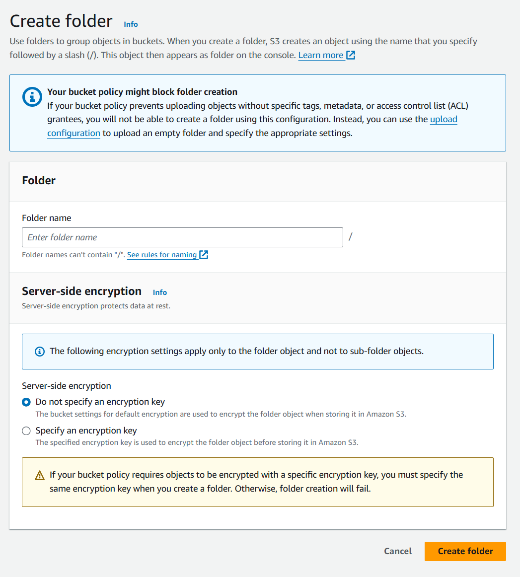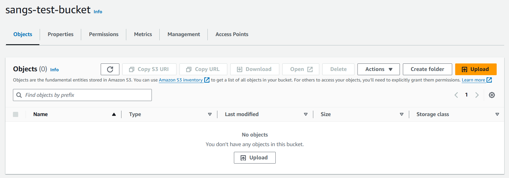 대충 버킷을 만들어주고 안에 들어가면 아래와 같은 화면이 나온다. 폴더를 만들 수 있는데 한번 만들어보자.