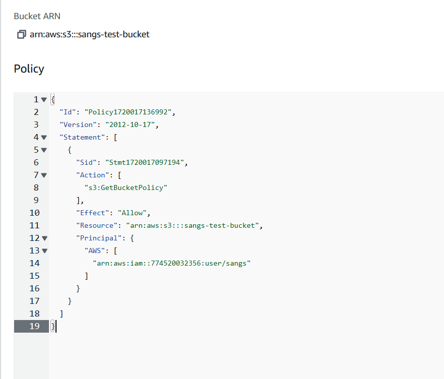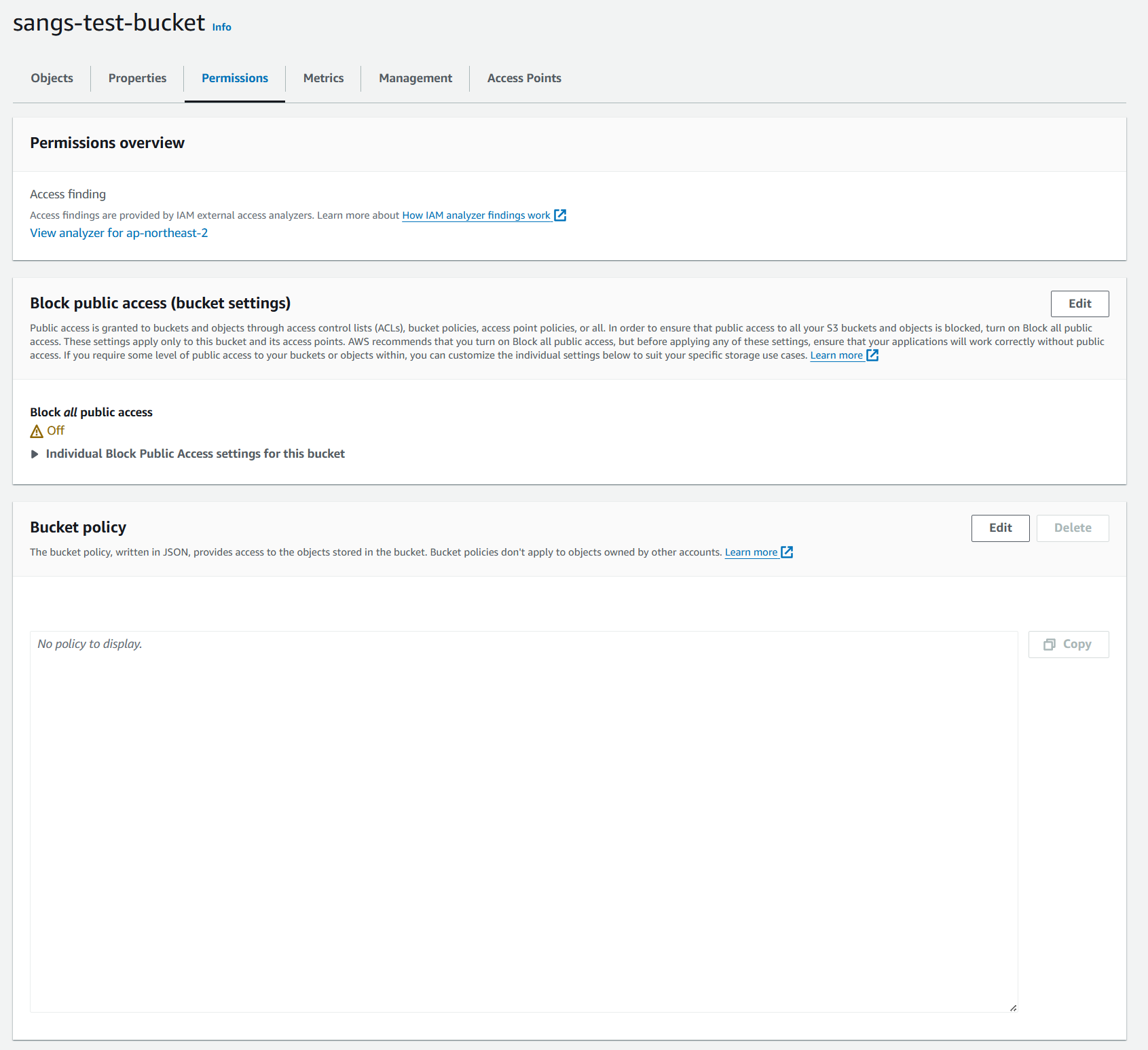 버킷 설정에 permissions 탭을 가보면 버킷 정책을 볼 수 있다. 여기에 JSON으로 버킷 정책 지정이 가능하다.