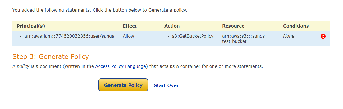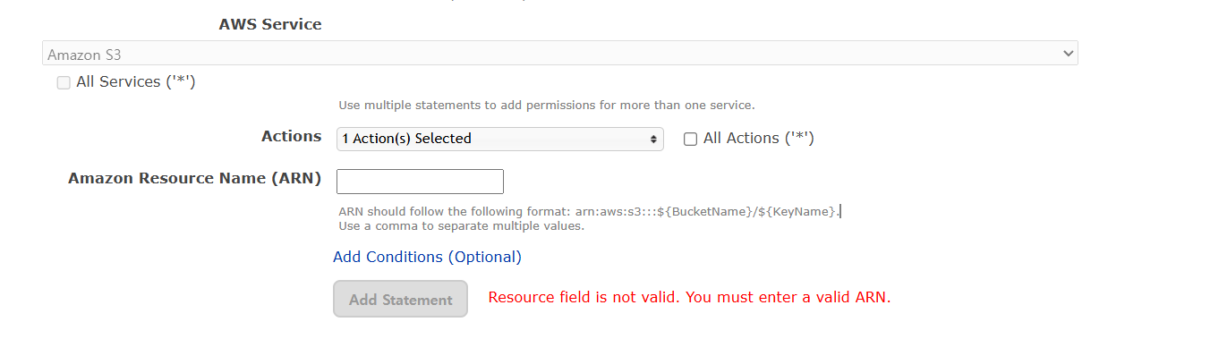 그리고 버킷 ARN도 넣어준다. actions에는 GetbucketPolicy를 선택했는데 actions는 종류가 엄청 많으니 개인적으로 찾아보는 것을 추천