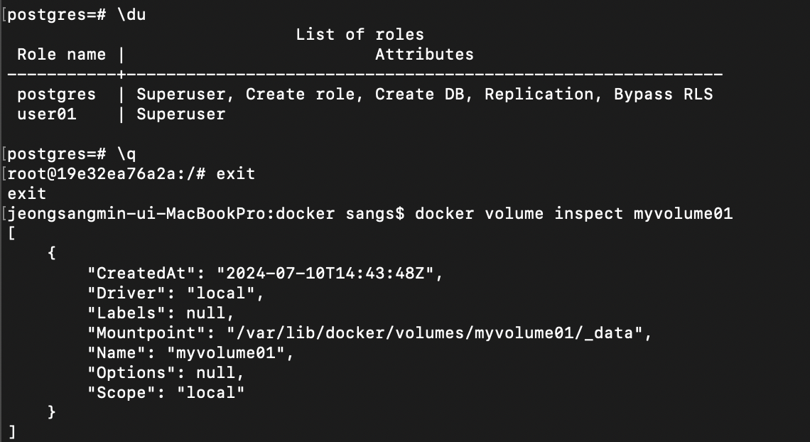 그 다음 컨테이너를 myvolume01을 이용해 다시 기동 하면 안에 유저가 똑같이 user01이 살아있음을 확인 가능